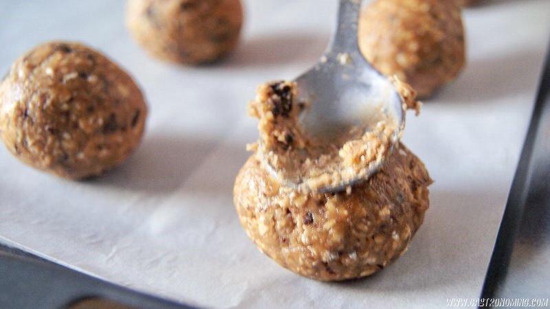 Sacamos nuestra mezcla del frío y sobre unas bandejas con papel de horno, con ayuda de una cuchara de café, hacemos unas bolas pequeñas de 30 gramos aproximadamente y disponemos sobre el papel de horno, presionando ligeramente por encima y con separación de al menos 3 centímetros entre cada bolita.