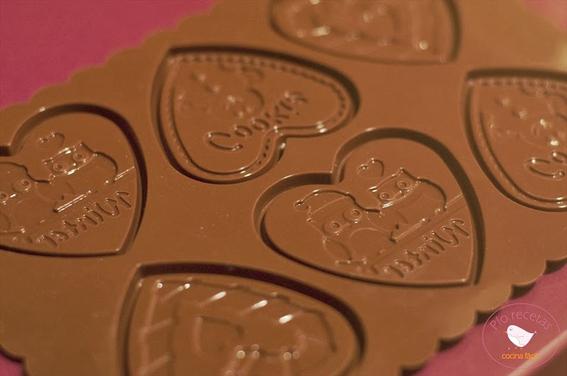 Mientras reposan las galletas preparamos las chocolatinas.Para ello usaremos el molde de silicona.Fundimos 100 g del chocolate en el micro y cuando esté fundido añadimos el resto del chocolate y mezclamos bien hasta que se funda por completo.