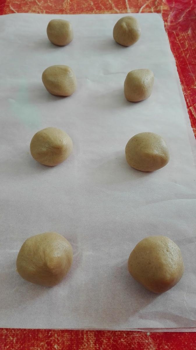 Sacamos la masa y vamos cogiendo porciones de masa que vamos a redondear entre las manos y vamos colocando bien separadas sobre la bandeja cubierta con papel de horno.