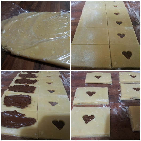 Cortamos rectángulos con la masa, a la mitad de estos cortamos un corazón al centro con un cortador de galletas de esa forma.