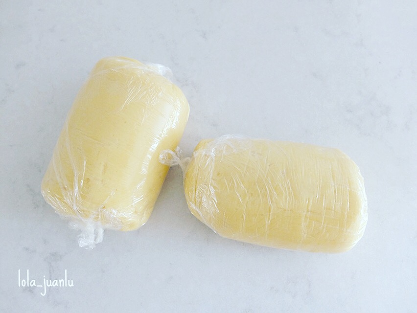 Como suelo tener el frigorífico lleno de cosas siempre, me resulta más fácil, una vez que hayamos terminado de amasar, dividir la masa en dos, envolverlas con papel film y darles forma de bola o cilindro a la masa. Y dejar la reposar en la nevera para que la masa endurezca y sea más manejable.