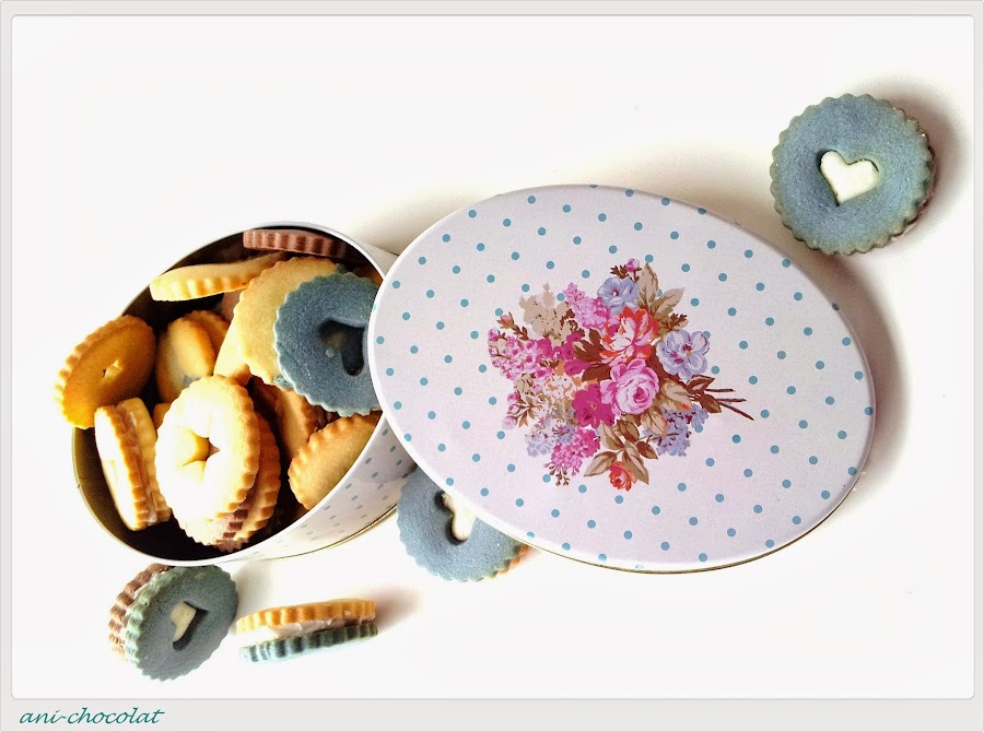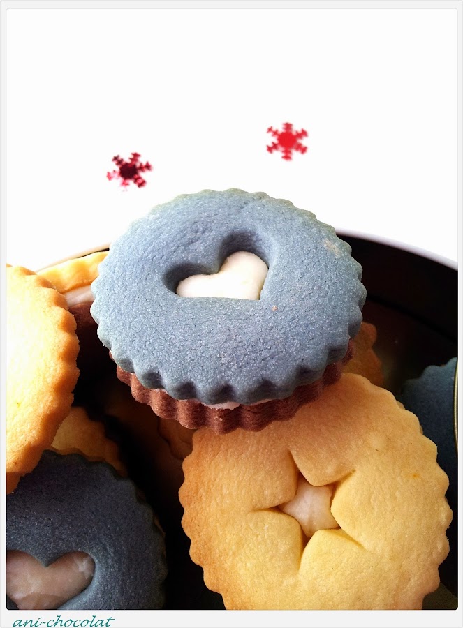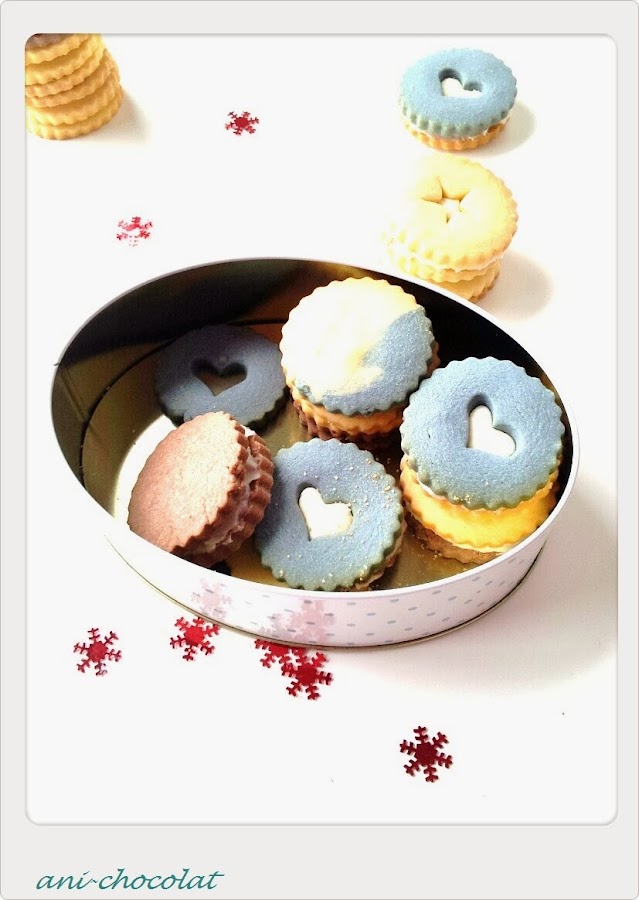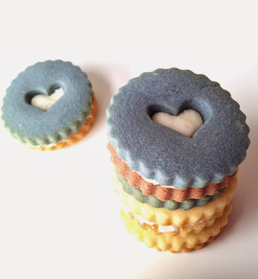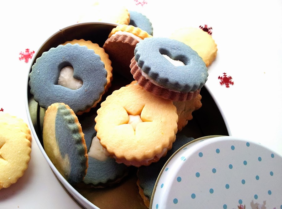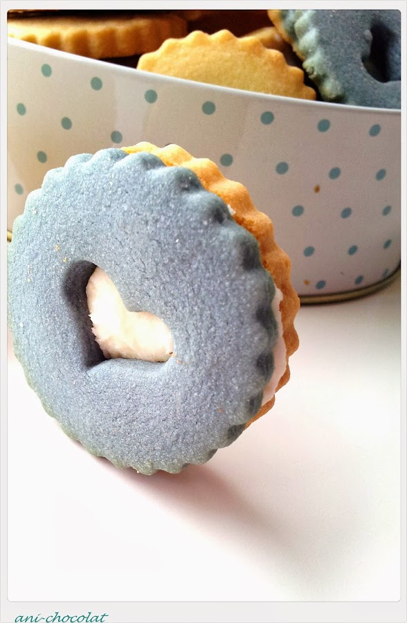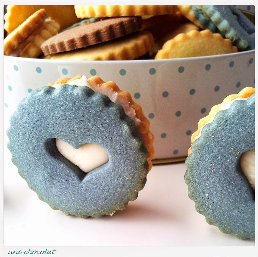 Para hacer las galletas de vainilla, mezclamos el azúcar glass con la mantequilla (yo lo hice con cuchara de madera), hasta obtener una textura cremosa. Añadimos la yema de huevo y mezclamos bien. Tamizamos la harina, el sobre de pudín de vainilla y la pizca de sal, se lo añadimos todo a la mezcla anterior hasta obtener una masa homogénea. Hacemos una bola, envolvemos en papel film y a la nevera (yo teñí una parte de la masa de vainilla con colorante alimentario Wilton). Mientras precalentamos el horno 160ºC calor arriba y abajo. Preparamos las galletas de chocolate de igual manera que las anteriores y a la nevera. Ya tendremos fría la masa de galletas de vainilla. La estiramos sobre papel film y elegimos el cortapastas que más nos guste. Metemos la primera tanda de galletas en el horno unos 10-12 minutos, que no se doren (en mi horno, 10 minutos y quedaron muy ricas y blanquitas). Dejamos enfriar sobre una rejilla. Sacamos la masa que nos queda en la nevera (la de chocolate) y hacemos exactamente lo mismo que con las de vainilla. Ahora, para la cremita de limón, batimos la mantequilla con el azúcar glass hasta obtener una textura cremosa, añadimos el zumo de limón y seguimos batiendo hasta tener la textura apropiada para untar. Montamos las galletas a nuestro gusto.