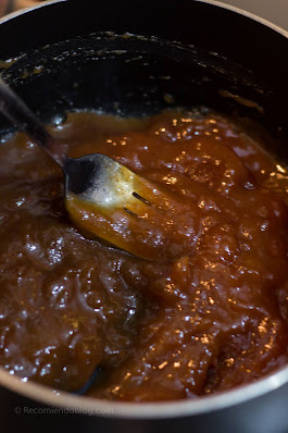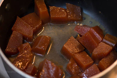 Cortar el dulce de membrillo en cubitos pequeños y llevar a una olla pequeña, con 1/4 taza de agua. Calentar durante unos minutos, a fuego bajo, y aplastar los cubitos con ayuda de un tenedor. Cuando tengas una pasta entable, retira del fuego. (También puedes hacer este paso en el microondas, aunque en la olla es bastante rápido).