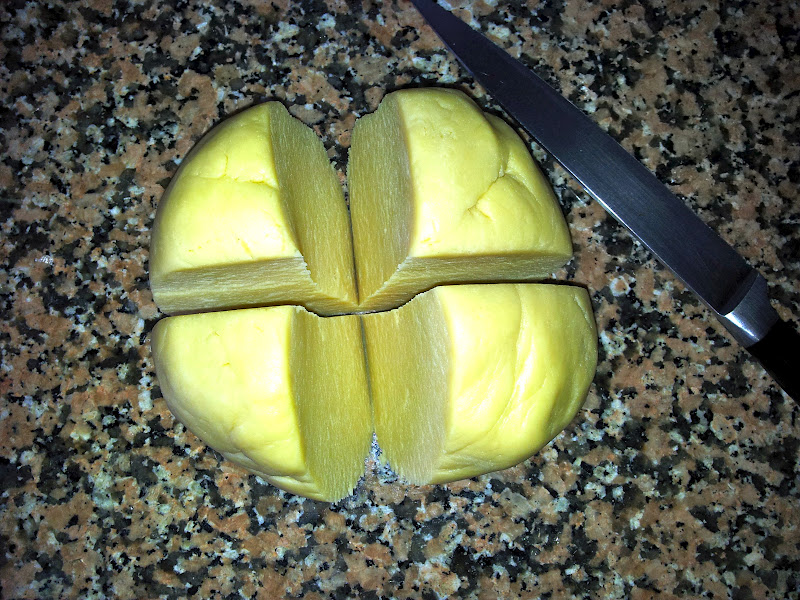 Sacamos la masa y la ponemos en el mármol o sobre papel de horno, le damos forma redonda y la cortarmos en 4 trozos iguales