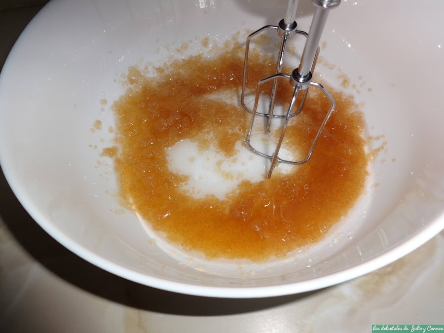 En otro, mezclamos bien con las varillas las dos clases de azúcar, el aceite, la mantequilla, la esencia de vainilla y la miel que habríamos calentado unos 10 segundos al microondas para que sea mas manejable.