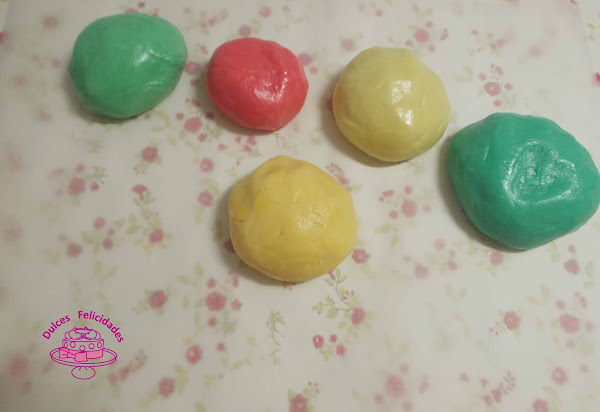 6. Cuando hayamos añadido e integrado todos los sólidos, dividir la masa en tantas partes como colores queramos obtener y añadir a cada uno el colorante correspondiente, amasando hasta homogeneizar.