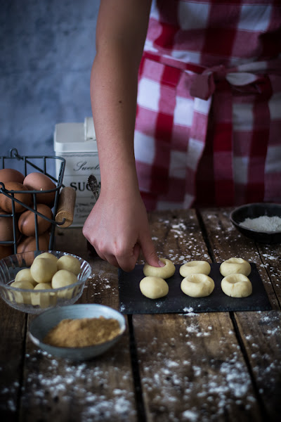 Vamos tomando trocitos del tamaño de una nuez como de unos 25 gramos más o menos, le damos forma redonda y las vamos colocando en una bandeja de horno forrada de papel de hornear.