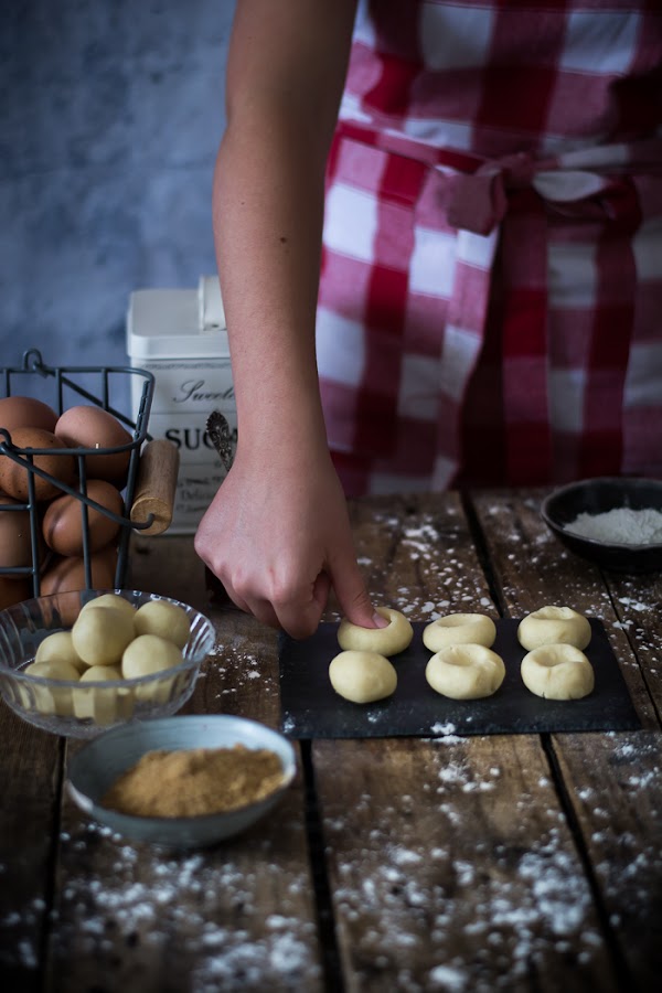 Hacemos un hueco en cada bolita con el dedo o con el mango de alguna paleta de cocina o con mano de mortero.