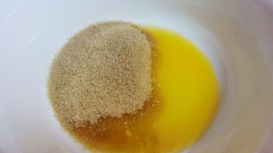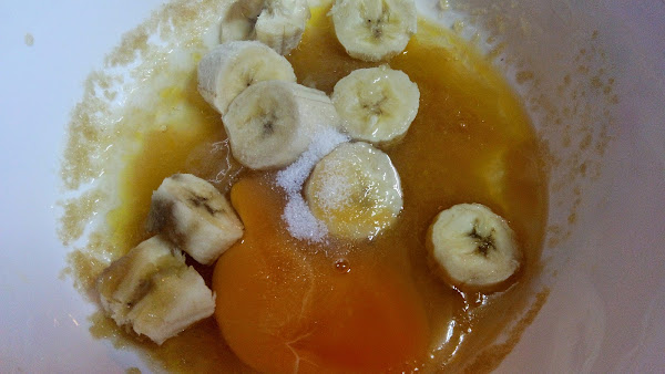 En otro bol mezclamos la mantequilla derretida, el azúcar blanco y moreno, el plátano,el huevo y el azúcar vainillado.