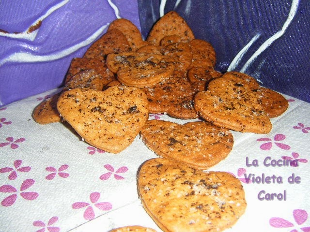 Pintamos las galletas con aceite de oliva, espolvoreamos con el polvo de alga nori y con un poco de sal.