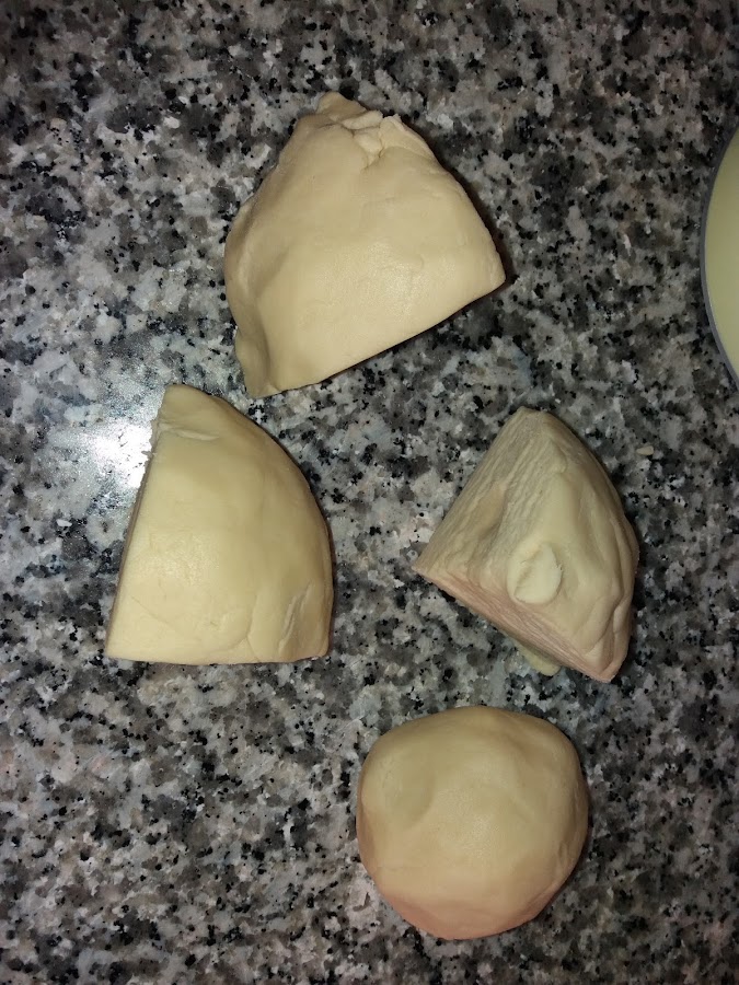 ahora la ponemos sobre la bancada y amasamos a mano unos minutos, la partimos en cuatro porciones