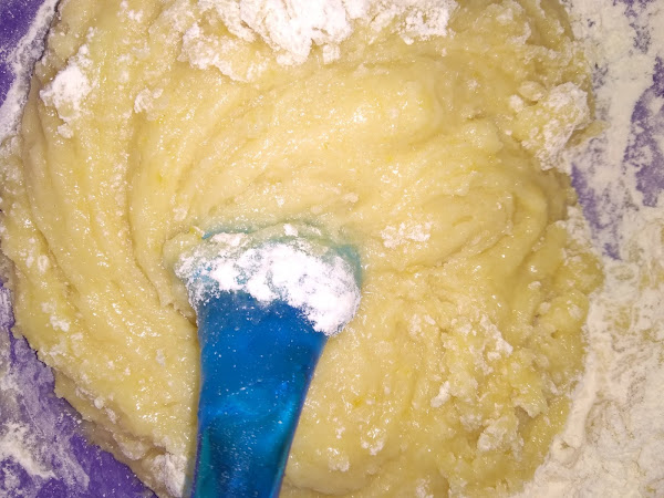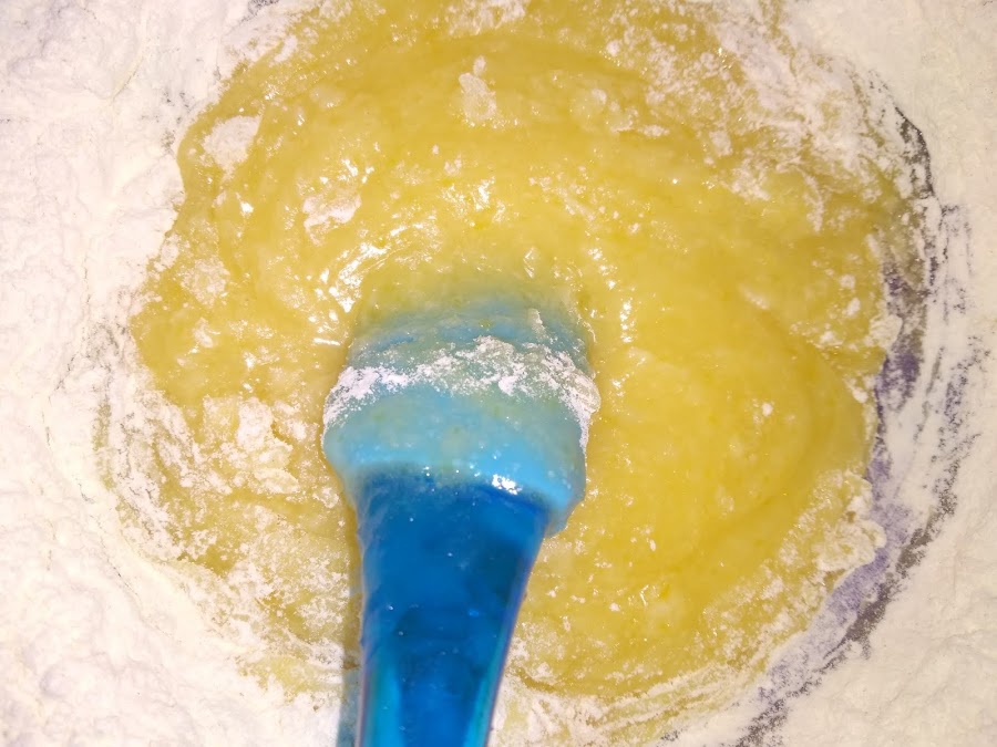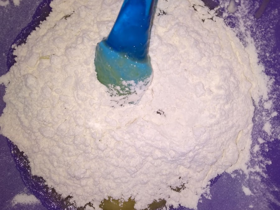 Añadimos la harina y la levadura tamizadas. Mezclamos bien, comenzamos con una espátula y acabaremos con las manos.
