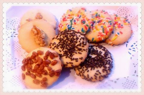 Estas galletas que véis aquí están hechas con la masa de galletas de decorar de siempre, pero que, una vez cortadas y antes de hornearlas, les he puesto virutas de chocolate, virutas de colores, alguna nuez y otras con algunos cereales.