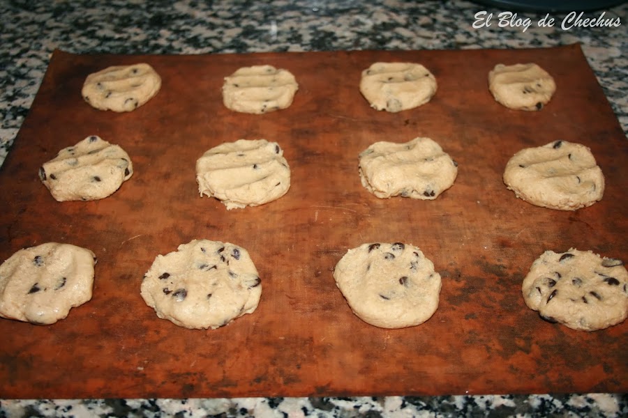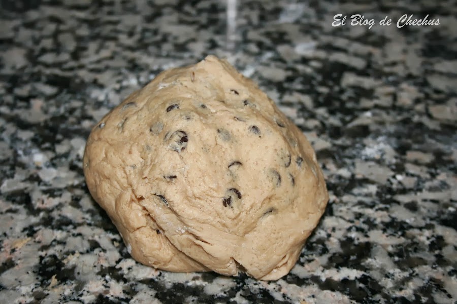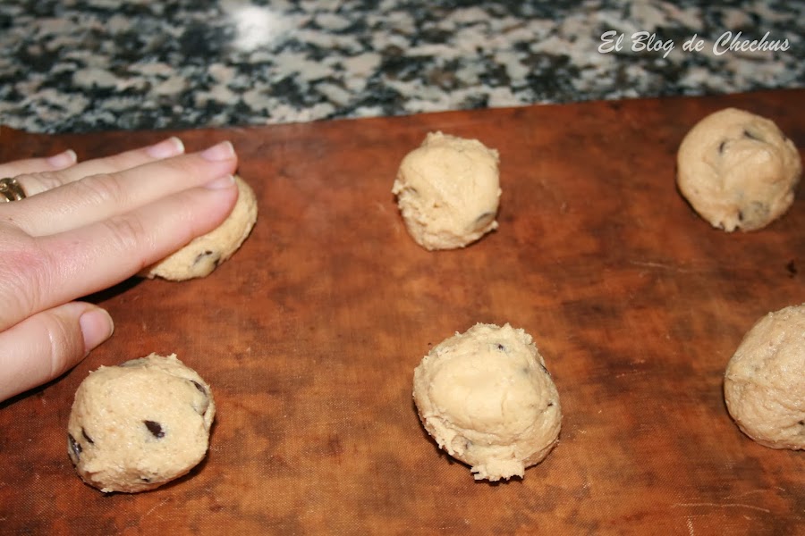 Mezclamos bien la mantequilla con los dos azucares, con ayuda de una batidora. Después incorporamos el huevo , y cuando esta bien integrado le ponemos la sal y el bicarbonato. Por último la harina y finalmente las pepitas de chocolate. Mezclar todo muy bien.