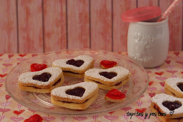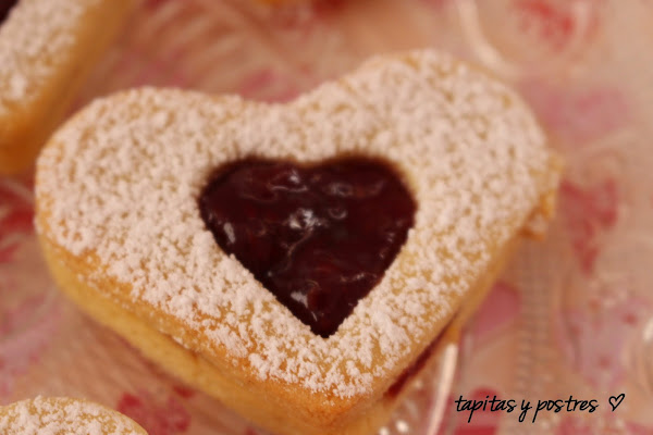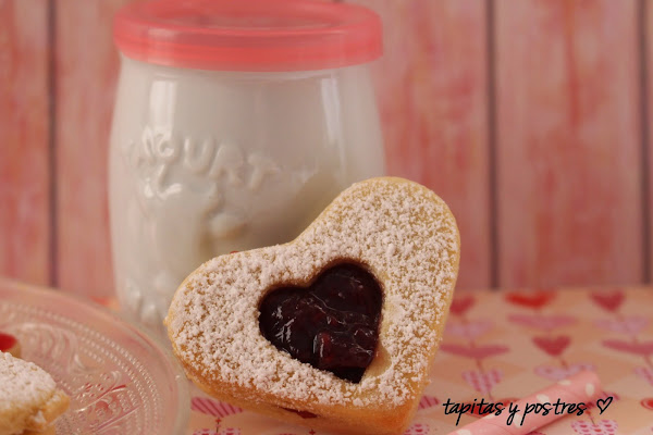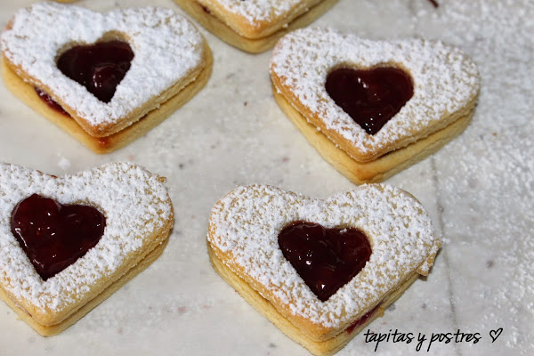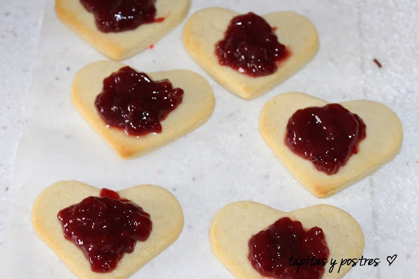 Dejamos enfriar sobre una rejilla y a las galletas con el hueco, le espolvoreamos azúcar glass. A las otras galletas le ponemos una cucharadita pequeña de mermelada de fresa. Colocamos la otra parte de las galletas encima.