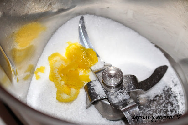 Triturar el azúcar con la piel de limón, 20 segundos a velocidad 5-10.