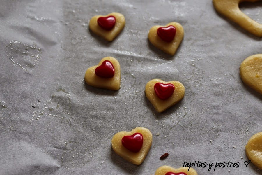Los huequitos que cortamos, se pueden aprovechar también. Yo les he puesto un caramelito rojo en medio. Horneamos a 180º unos diez minutos. Las sacamos aunque estén blancas.