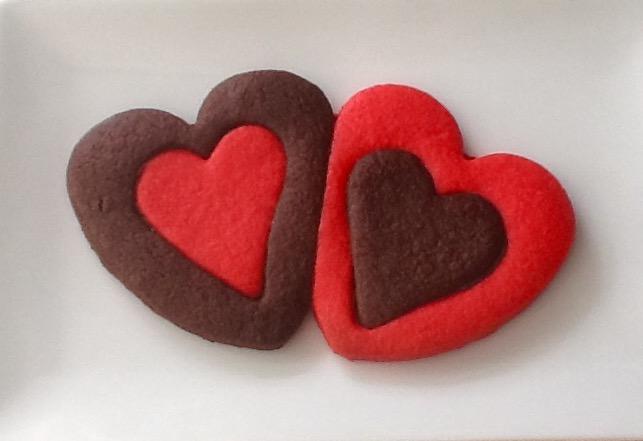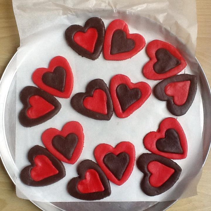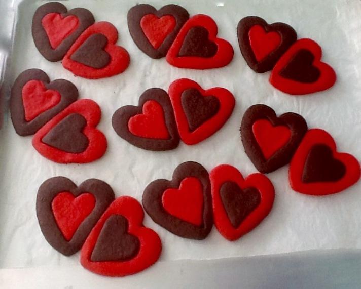 Con cortadores de distintos tamaños haremos nuestros corazones intercambiando los colores del centro al volver a montarlos, simplemente los juntaremos de dos en dos y al hornear quedarán unidos.