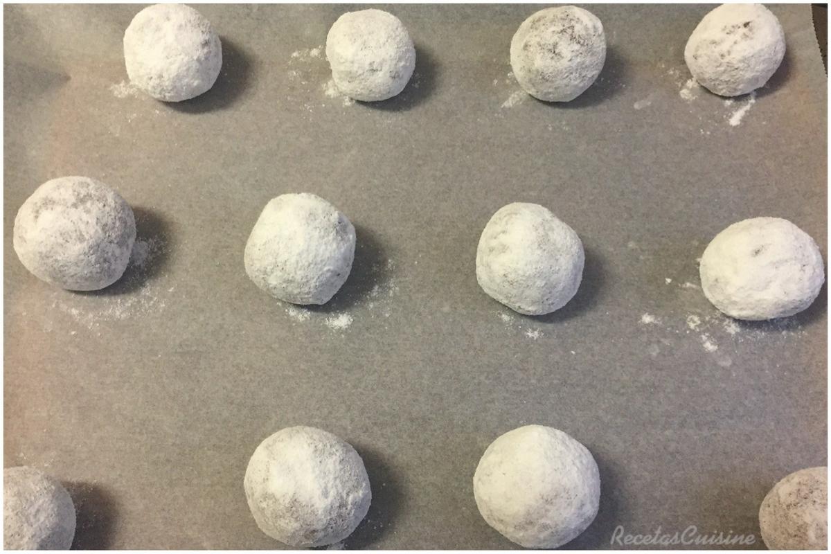 7. Rebozamos muy bien las bolitas en el azúcar glass, (podemos hacerlo en la CuCo siguiendo esta receta) sin que se vea nada de chocolate, sólo blanco.