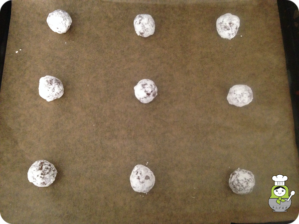 Transcurrido el tiempo de enfriado en la nevera, es el tiempo de pringar las manos. Sacamos la masa y formamos bolas de 2,5 centímetros (algo más pequeñas que una pelota de golf) y las rebozamos en abundante azúcar glas.