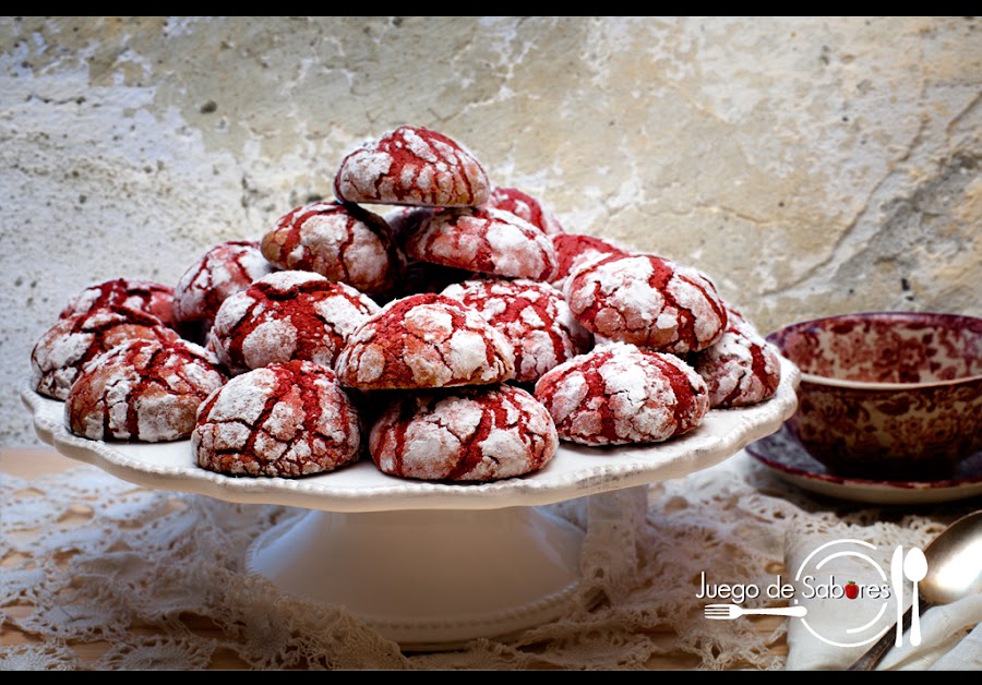 Son así. No es que al sacarlas del horno se me hayan roto, partido o adoptado esta forma tan poco presentable, no. Son así. Se llaman galletas craqueladas (crackle cookies) y como tienen ese color de terciopelo rojo también se las conoce como “red velvet”. Se llama craquelado al conjunto de grietas que a veces aparecen en las pinturas antiguas. Eso, que no deja de ser un signo de antigüedad, ahora se ha puesto de moda como procedimiento decorativo para envejecer muebles o pinturas que hace cuatro días aun estaban en los talleres. Antigüedades de pacotilla, vamos. Pero estas galletas Red Velvet han salido del horno hace pocas horas y, os aseguro que como están de rechupete, les quedan poquísimas horas de vida. Para la foto, nada mejor que un fondo de pared vieja y desconchada; vamos, craquelada.
