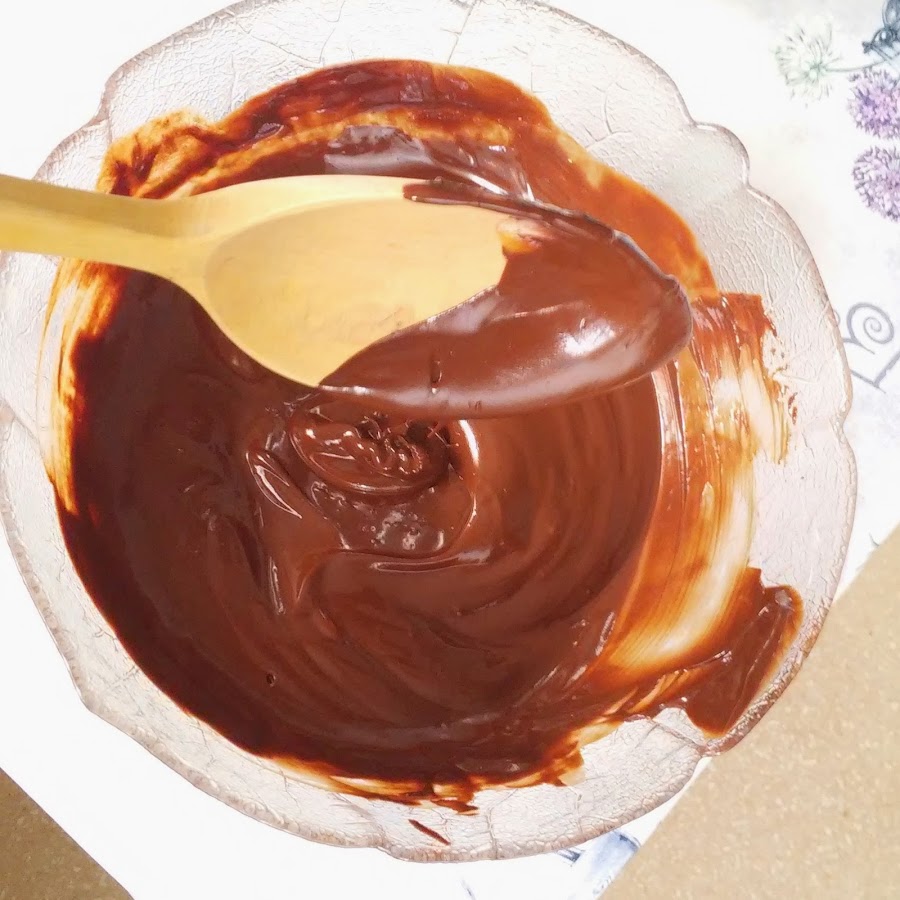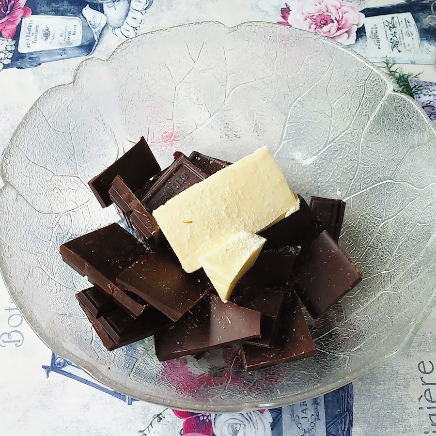 Fundimos el chocolate con la mantequilla en el microondas o en un cazo al baño Maria. Añadimos una pizca de sal.