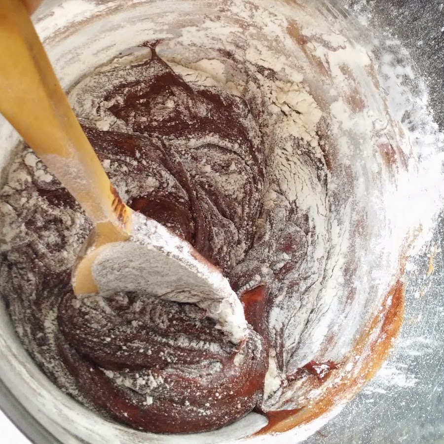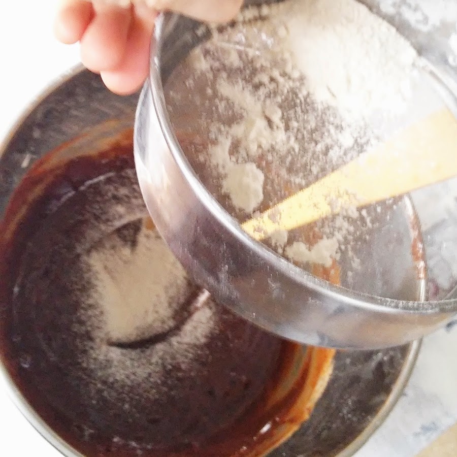Por últimos añadimos la harina tamizada poco a poco y mezclando con movientos envolventes para que no nos baje la masa.