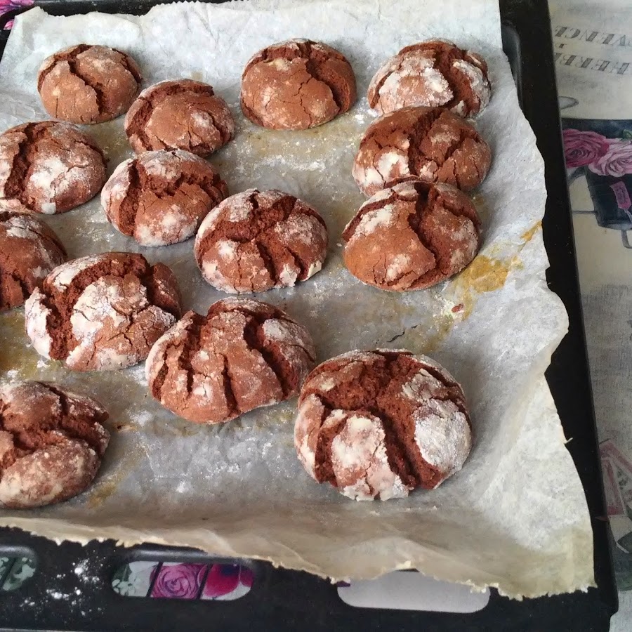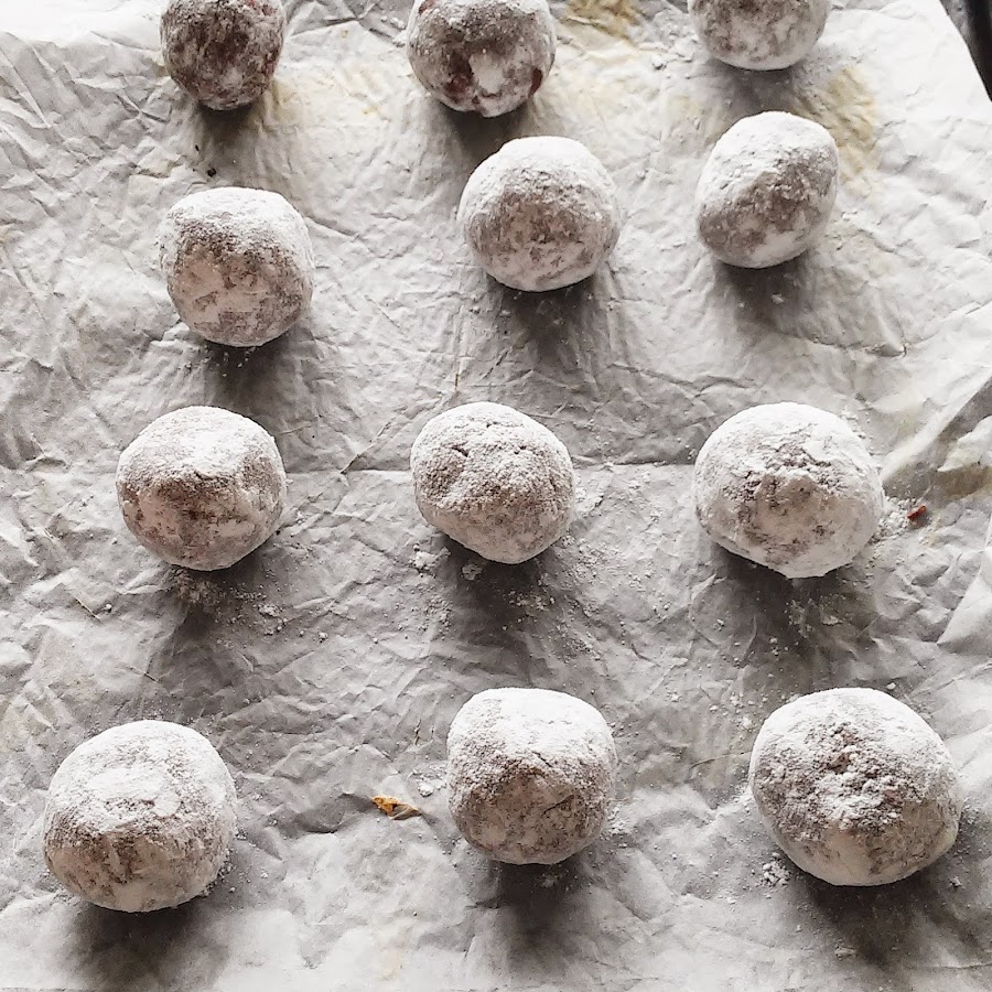 Hacemos bolas regulares algo más pequeñas del tamaño de una pelota de golf y las rebozamos bien con azúcar glas. Dejamos bastante espacio entre ellas en la bandeja porque crecerán mucho al hornearlas.