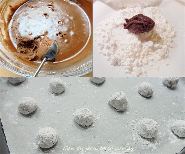 8. Para que sean todas del mismo tamaño yo uso un sacabocados. Se coge una porción de masa, se vuelca sobre el plato que tendremos preparado con azúcar glas y se van formando bolitas. La ventaja de hacerlo así es que no nos pringamos las manos demasiado, rebozamos esa cantidad y le damos forma de bola, aunque tampoco te preocupes de que queden perfectas ya que en el horno se formará una galleta redonda de cualquier manera. Lo que sí es importante es que tengan una buena capa de azúcar glas para que el craquelado quede bien.