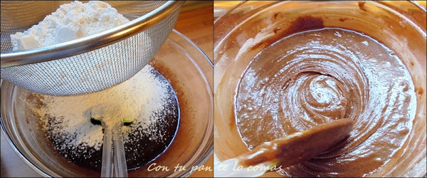 5. Mezclamos la harina con la cucharadita de levadura en polvo, tamizamos a través de un colador y añadimos a la mezcla de chocolate poco a poco, removiendo bien para que no se forme ningún grumo.