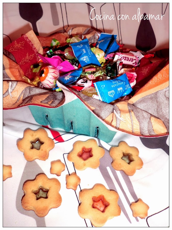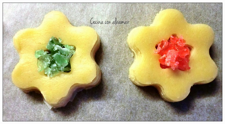 Sacaremos las galletas y rellenaremos los huecos con los caramelos, intentaremos que no nos sobresalga mucho porque con el calor del horno al fundirse burbujean un poco y nos pueden estropear las galletas por los bordes ( a mí me pasó en más de una) y no, no os las voy a enseñar porque fueron las que nos comimos para comprobar que estaban ricas!! jajaja