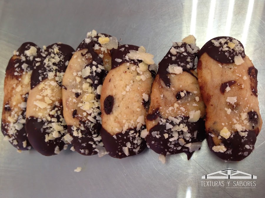 En un bol, poner la cobertura de chocolate en trozos e ir calentando en el micro en periodos cortos de 30 segundos a máxima potencia, procurando no quemar la cobertura. O si lo prefieres al baño maria hasta fundirse. Bañar los extremos de las galletas con la cobertura y decorar con las almendras troceadas por encima.