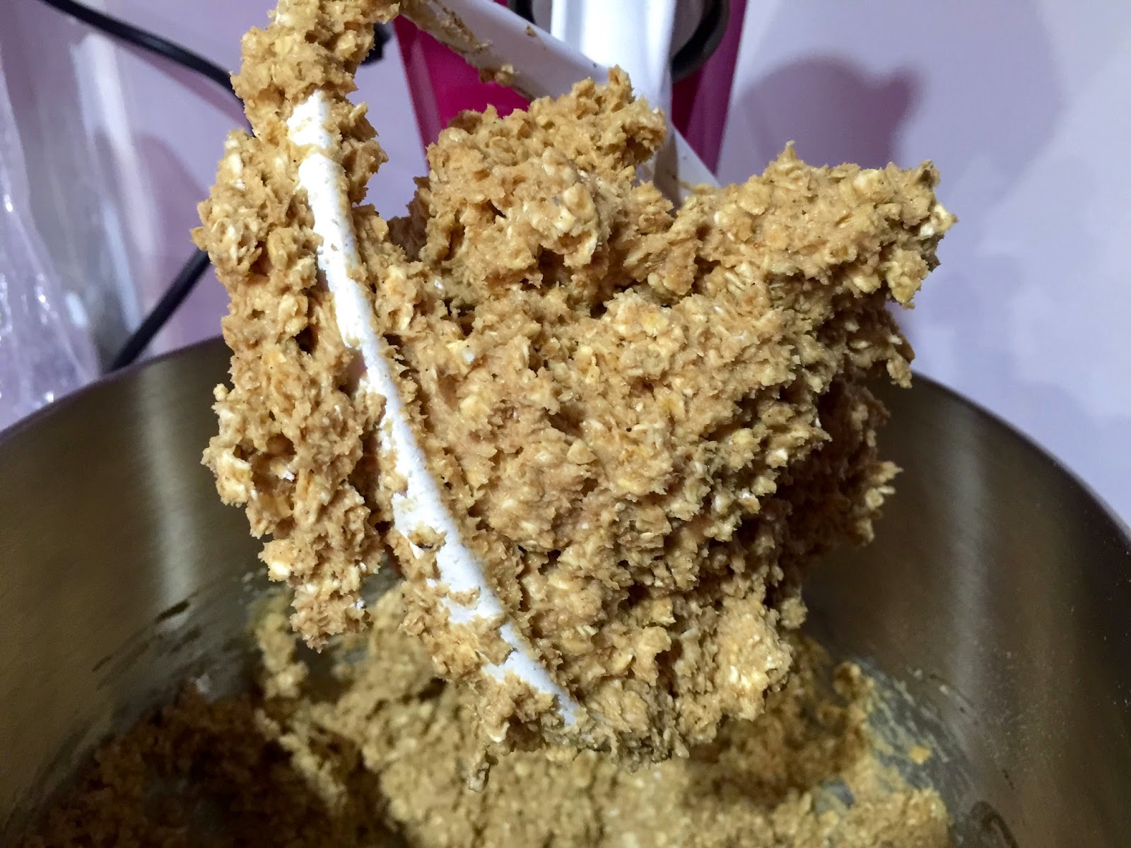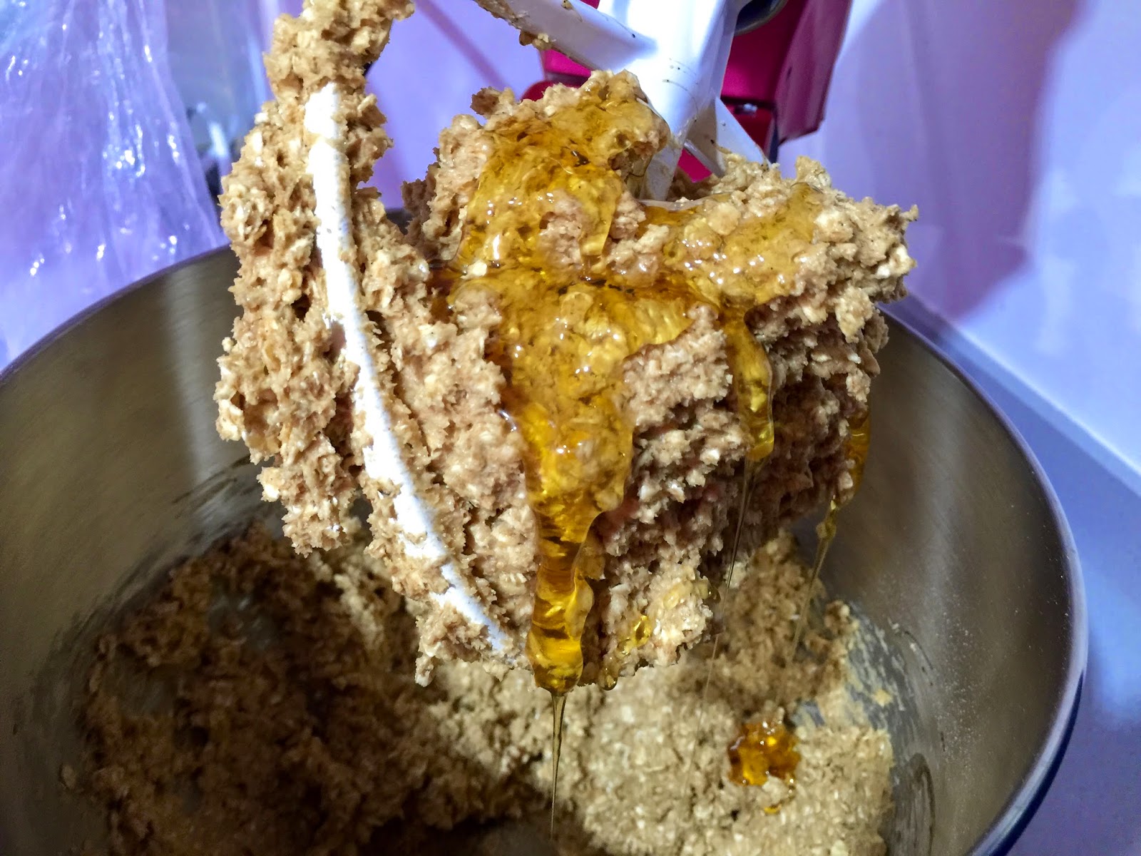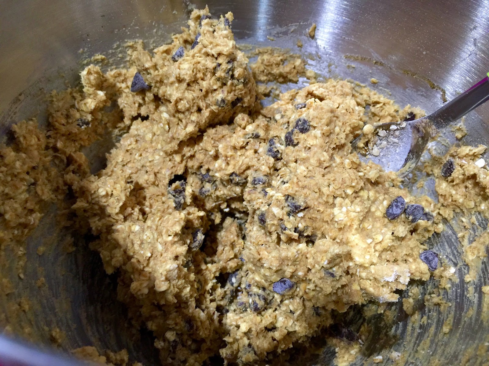 4. Por último añadimos la cucharada de miel y las gotitas de chocolate negro. Mezclamos ligeramente y ya tenemos nuestra masa de galletas lista.