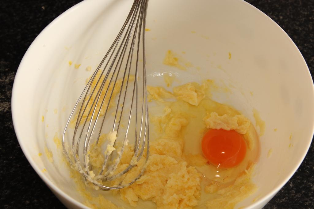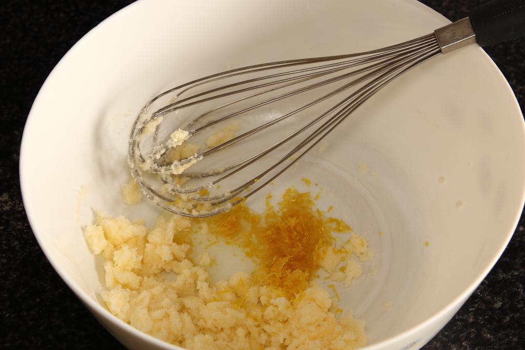 En un bol ablandamos la mantequilla en el microondas durante unos minutos, añadimos el azúcar y mezclamos con una varilla manual. Incorporamos la ralladura y el zumo del limón y seguimos mezclando.