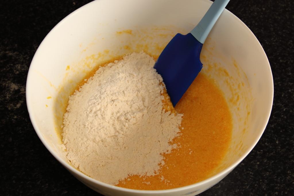 Rebañamos bien las paredes del bol para aprovechar todo. Echamos el huevo y mezclamos de nuevo. Tomará un aspecto de cortado, pero no importa. Por último añadimos la harina tamizada con la levadura y la sal, con una espátula mezclamos y tendremos como resultado una masa homogénea y blandita.