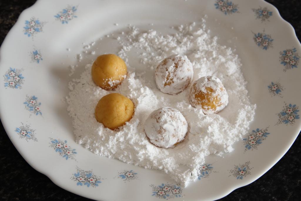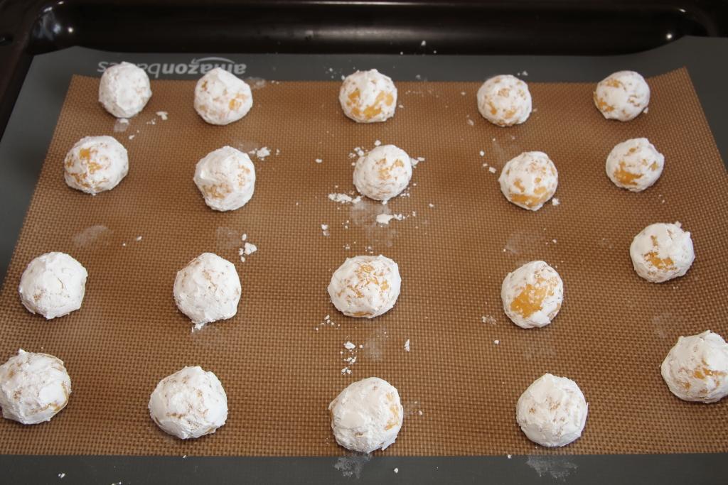 Transcurrido el tiempo, sacamos de la nevera y vamos formando las galletas, hacemos bolitas y las vamos rebozando en azúcar glas, cubriéndolas con una capa gruesa de azúcar. Forramos una bandeja de horno con papel de hornear o una lámina de silicona para éstos menesteres, disponemos las bolitas de galleta y horneamos 15 minutos, a 180ºC, calor arriba y abajo.