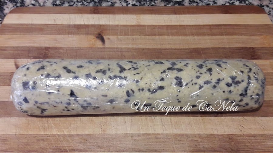 Formar un rulo, liar con film, como un caramelo, y llevar al frigo unas 2 horas.