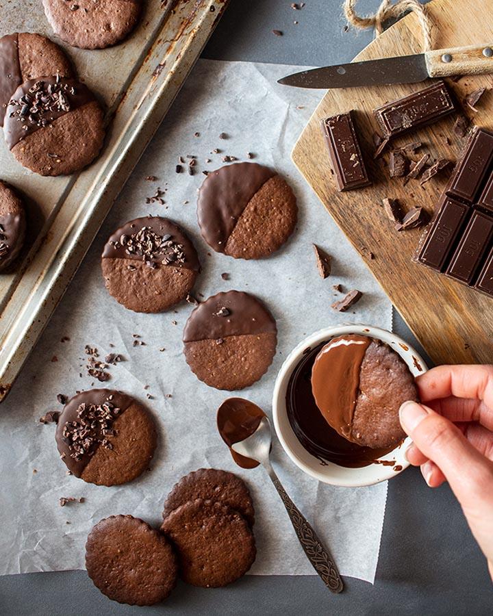 Una vez frías, derrite el chocolate y échalo en bol pequeño pero profundo. Sumerge cada galleta en el chocolate hasta la mitad, escurre bien lo que sobre y vete colocándolas sobre la rejilla. Antes de que solidifique el chocolate espolvorea los nibs de cacao por encima. ¡Ya están listas!