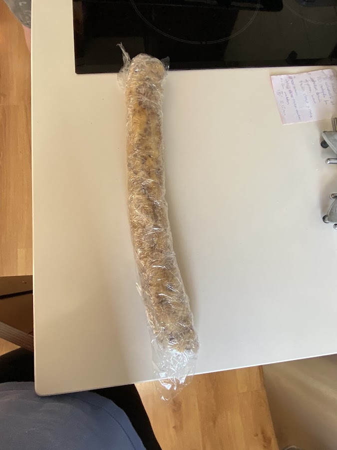 6. Quitamos el film y cortamos el rollo en medallones de un dedo de grosor.