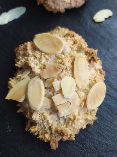 Ya tenemos la masa lista!! Ahora sólo queda poner un papel de horno en la bandeja, y ponemos montoncitos de masa encima. Ponemos la almendra laminada encima y horneamos durante unos 12-15 minutos, hasta que veamos que empieza a dorarse.