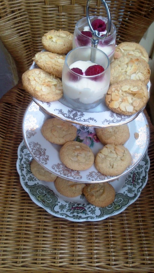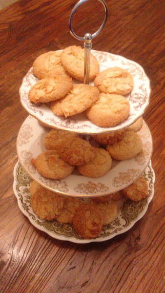 Sacamos y cortamos en rodajas de 1 cm 1/2 y colocamos sobre la bandeja de horno que tenemos preparada, dejando un poco separadas porque luego crecen en el horno. Horneamos 15 minutos hasta que cojan un poquito de color, no dejándolas dorarse apenas. Dejamos enfríar en la bandeja antes de retirarlas. Y las sacamos de la bandeja con mucho cuidado para que terminen de enfríar en una rejilla. Cuidado que se rompen con facilidad. Son muy delicadas. Antes de meterlas a hornear podemos colocar encima almendra cruda fileteada.