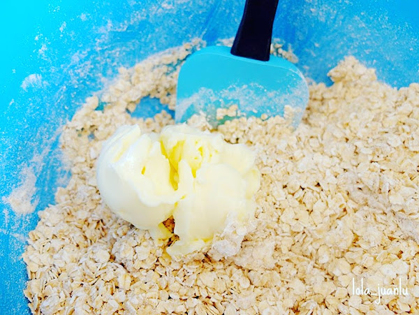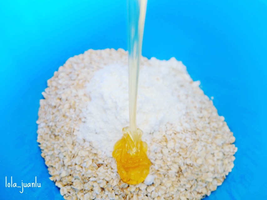 Mezclamos los copos de avena, la sal, la harina y la miel en un bol.