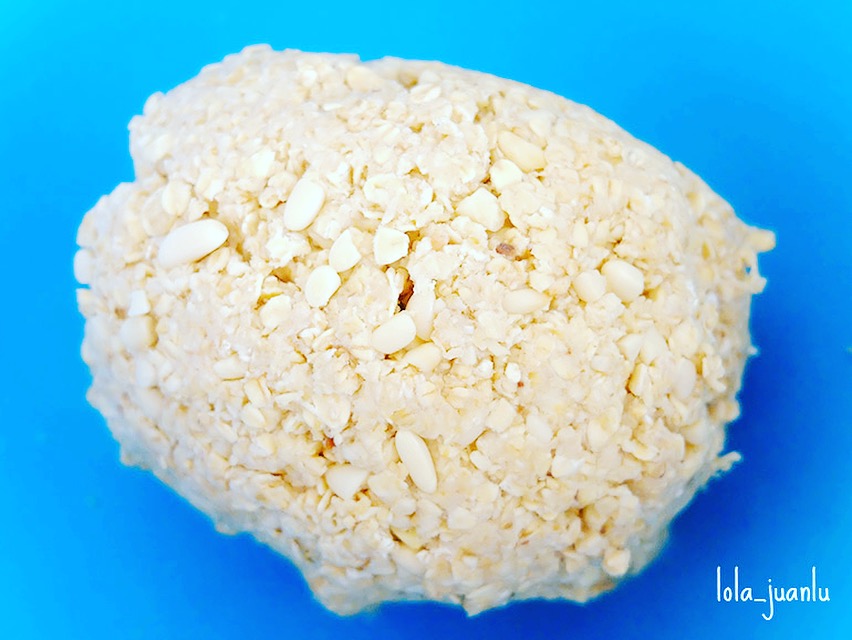 Incorporamos los piñones y amasamos hasta que queden bien integrados en la masa.