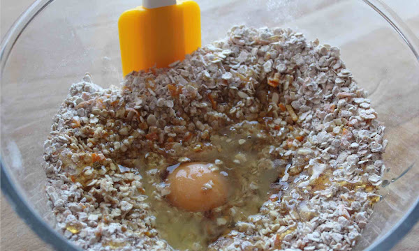 Añadir, el huevo, la miel, el aceite, y el zumo de naranja