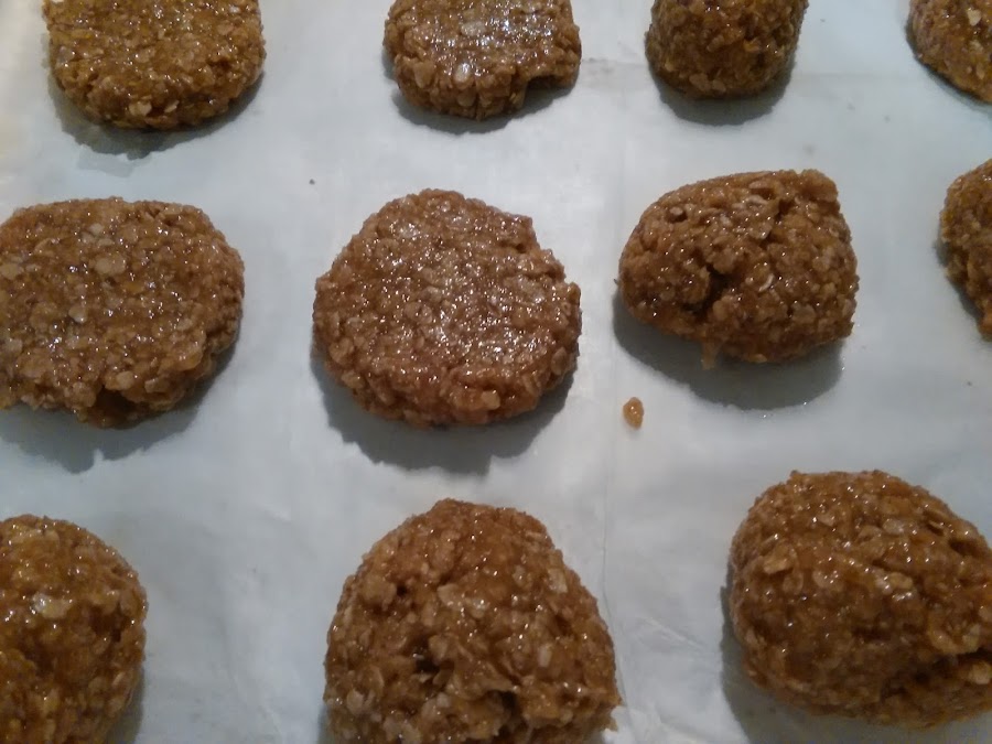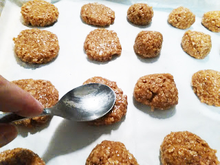 Aplanamos con la mano o con la misma cuchara y colocamos en una bandeja de horno, previamente forrada con papel de horno (papel mantequilla).