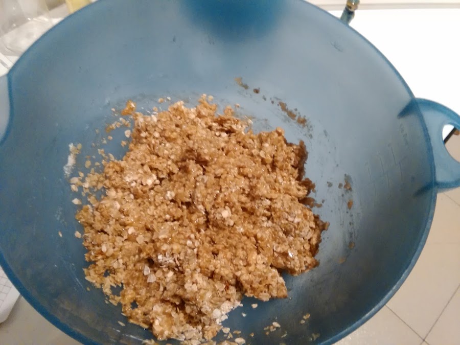 En un bowl mezclamos con una espátula o cuchara de palo los ingredientes secos (copos de avena, harina, azúcar moreno, levadura y sal).