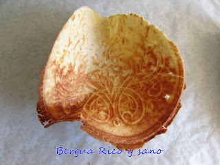 6. Con una espátula podremos sacar fácilmente la galleta. La ponemos a reposar sobre plano, por ejemplo sobre una rejilla de horno. Lo de "sobre plano" es porque, una vez que se enfrían, no hay manera de cambiar la forma que hayan tomado sin romperlas. De hecho, en este paso, hay quien las rula para hacer barquillos de cucurucho para helado o las pone sobre un vaso del revés para hacer cuenquecitos para helado u otros postres.