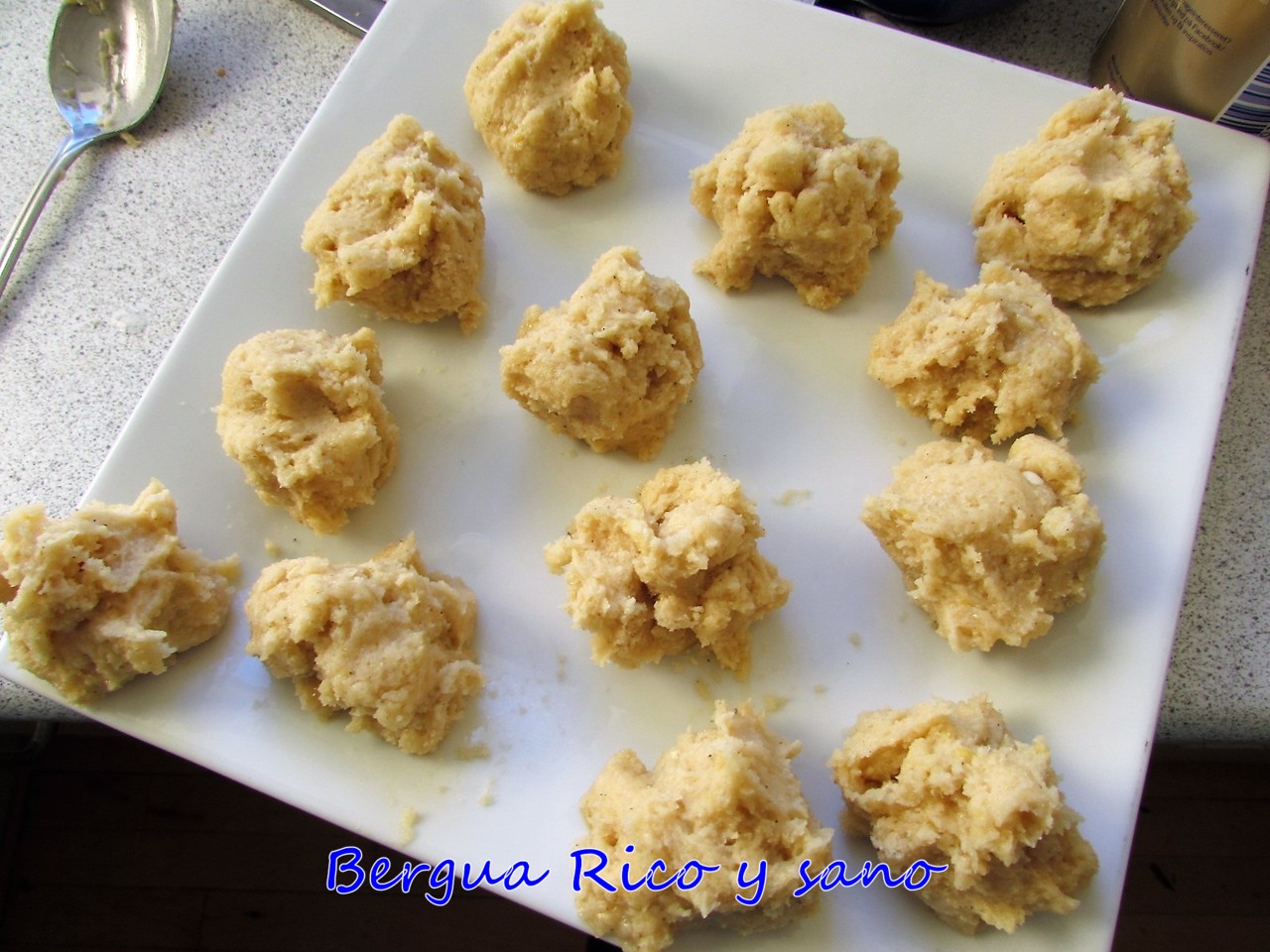 4. Podemos ir cogiendo masa cada vez que necesitemos o prepararla en montoncitos del tamaño de una nuez grandota. Mejor poner nuestros montoncitos de masa sobre papel de horno para que no se peguen, pero no es imprescindible.