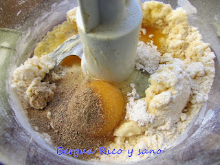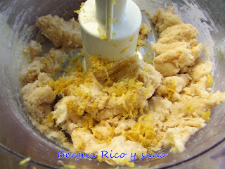 El procedimiento es el mismo, solo que añadimos 1 huevo y el yogur y al final la ralladura. La masa resultante es más pegajosa. Por lo demás, todo igual.