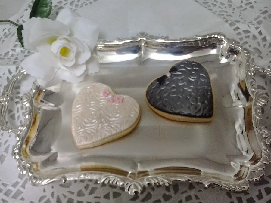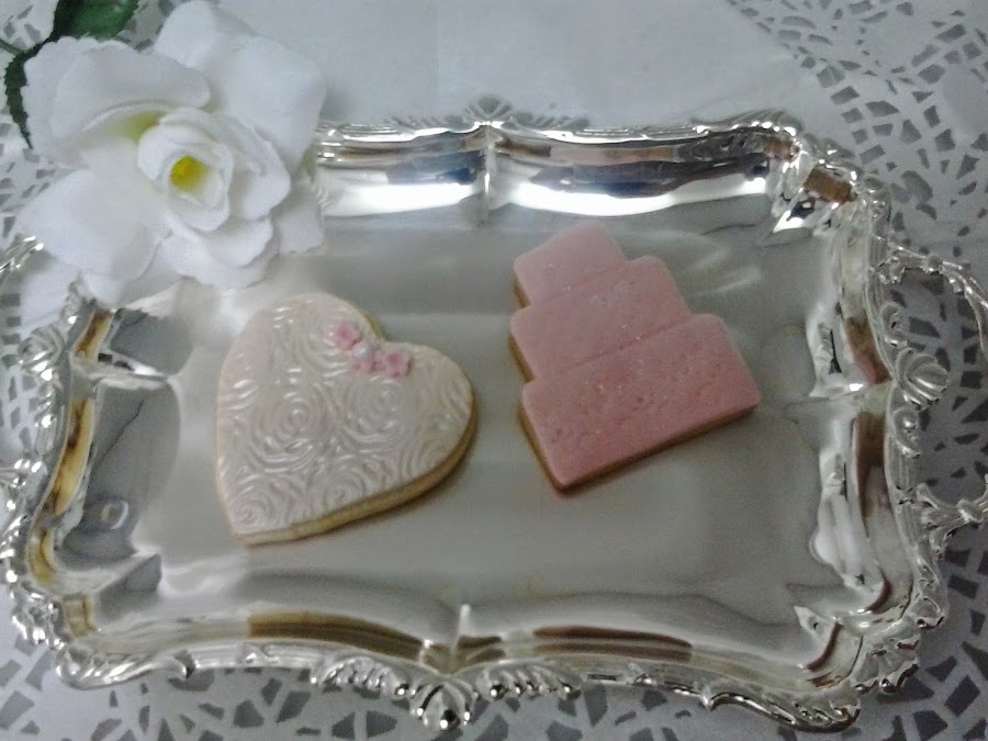 Una idea que me pareció muy bonita fue la de los corazones en forma de novio y de novia y otra galleta en forma de tarta nupcial.